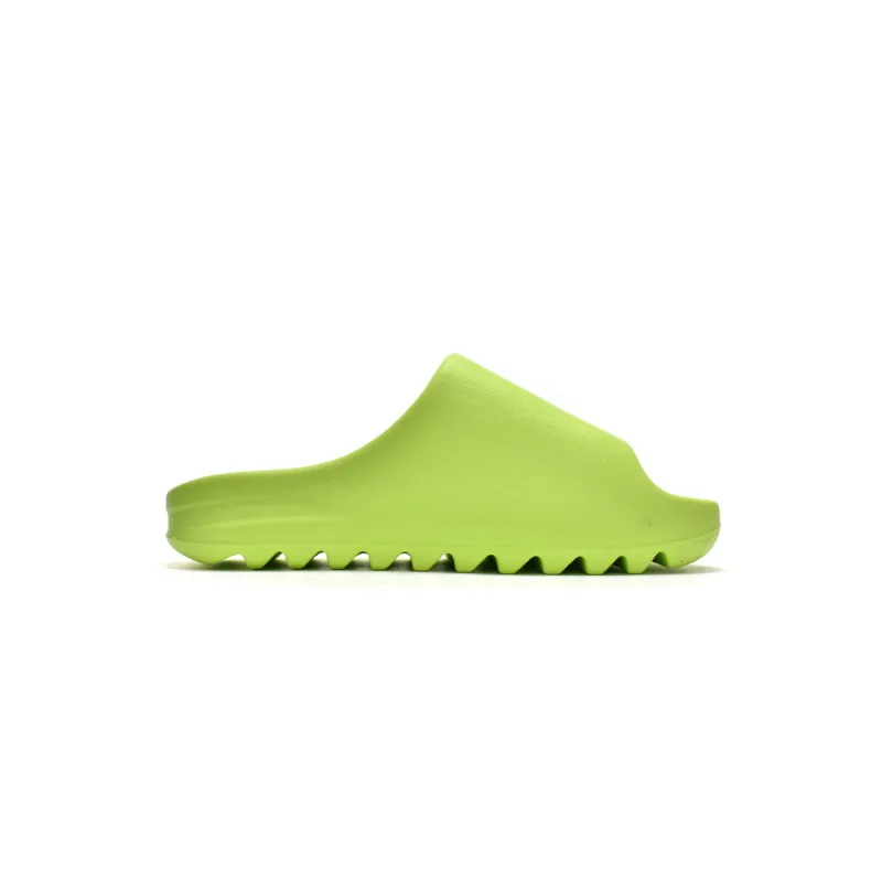 About This Product: A bright and vivid "Green Glow" makes up the latest adidas Yeezy Slide reps, as a single piece of infused EVA foam is given an all-over neon green treatment. Apart from the small adidas three-stripes logo on the insole, there is no branding on the entire sandal, and the silhouette shape of the slipper is simple and clean, with deep horizontal grooves for grip.
