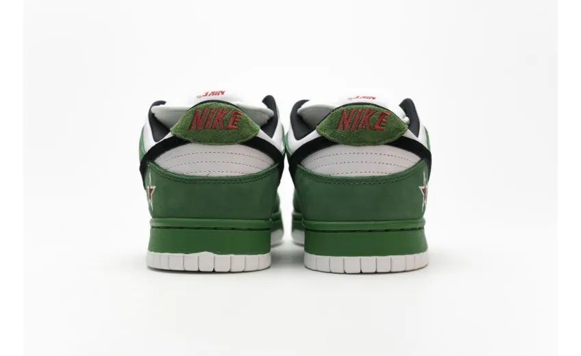 About This Product: Inspired by the signature green cans used by the Dutch beer company, the Fake Nike Dunk Low Pro SB ' Heineken. ' A white leather top with green nubuck overlays and a black suede Swoosh displays the low-top. On the tooling of the shoe, the colour arrangement up top is reiterated with a green midsole and a shiny white outsole. Bordered in white, the horizontal heel is graced by an embroidered red star.