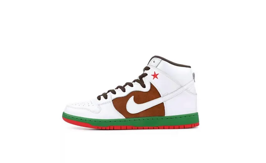 About This Product: A re-release of the 2004 Dunk Low 'Cali,' the Fake Nike Dunk High SB 'Cali' is modeled after the California state flag. Featuring white tumbled leather throughout the upper, the quarter panel is finished in Pecan to represent the flag's bear. A red star emerges near the collar, while the green midsole and red outsole finish off the inspired look.
