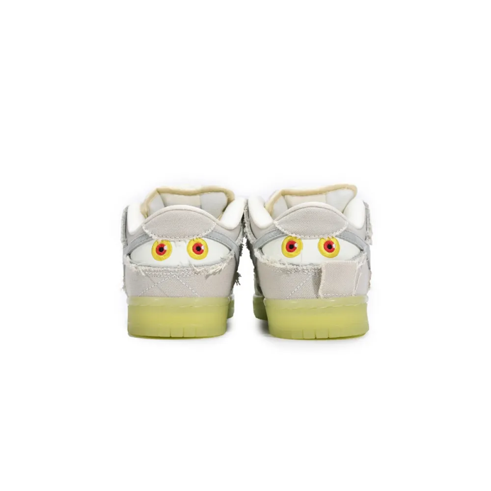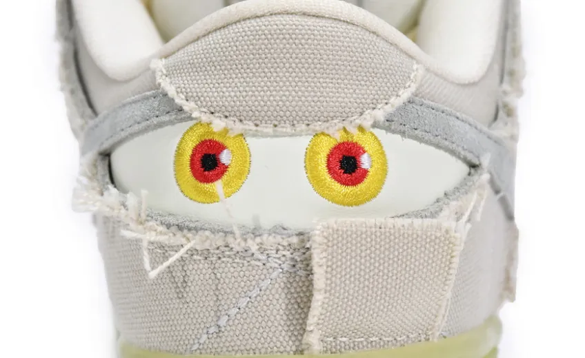 About This Product: Celebrate Halloween with a monster-inspired shoe in the Fake Nike Dunk Low SB 'Mummy.' A off-white canvas upper has tonal decorative stitching with frayed edges that can be torn away to show a bluish-gray suede underlay that the Swoosh is made up of as well. The semi-translucent rubber cupsole and the pair of embroidered eyes on the back heel glow in the dark. Additional details include an embroidered spider on the left toe box and an ancient Egyptian Eye of Horus graphic on the interior tongue.