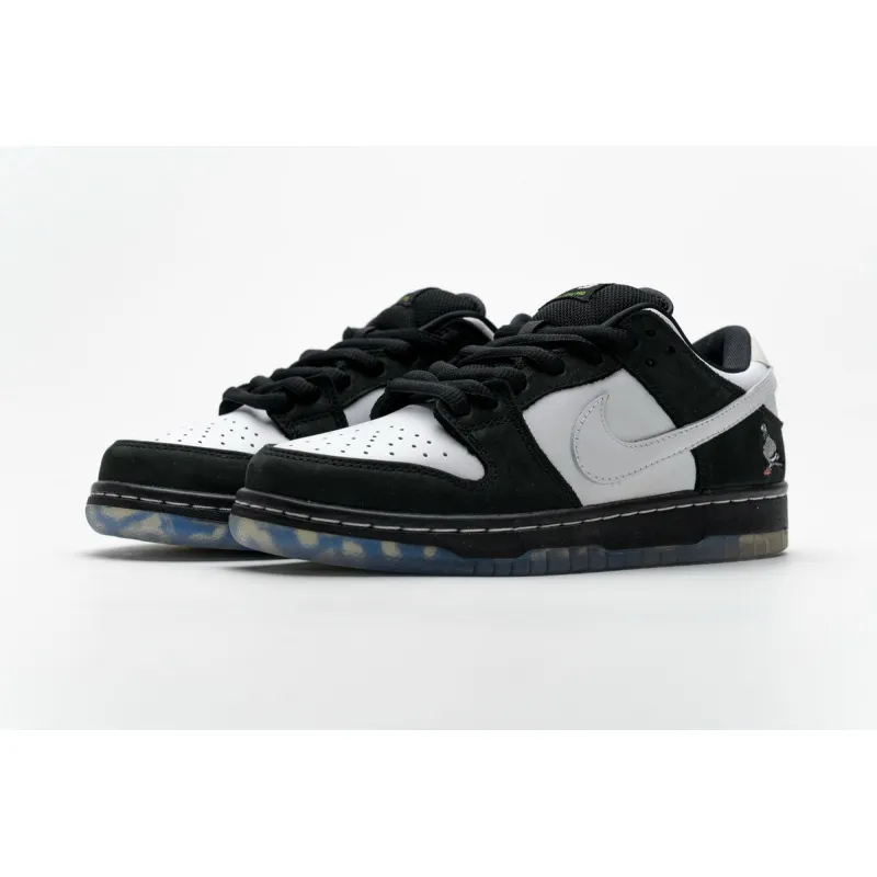 About This Product: The Jeff Staple x Fake Dunk Low Pro SB ‘Panda Pigeon’ extends Staple’s enduring collaboration with Nike SB. The moniker lives up to its name with a black and white pattern on the leather and suede upper, finished with the integral pigeon on the lateral heel. A translucent outsole displays a collage of newspaper headlines referring to the legendary Pigeon Dunk launch from 2005.